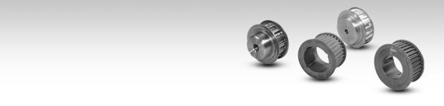 Timing belt pulleys. With hub or for taper bushing for easy mounting and dismounting. Metric or inches.